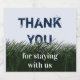 Say thank you to your rental home guests with this inexpensive appreciation beer bottle label. This simple to use label features dark green grass and a light blue "sky". The grass has been painted and given texture to allow the words "Thank You" to peek out from behind the blades. "Thank You for staying with us" can easily be customised to suit your house rental or summer home.