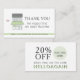 Text reads "THANK YOU for supporting my small business" with an illustration of a shop with a bright green awning and a pink heart. You can edit the text over the window with the name of your store or first name or leave it blank. The back has an editable discount with a coupon code. Green border. Add into your packaging to let your customers know you appreciate their business. Great for online sellers.