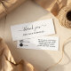 The enclosure card features elegant script saying "Thank you" with social media icons and contact details on the back all on a clean white background making the elegant script and all your social media icons and details about your small business stand out.