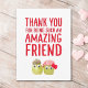 Brighten a vegan friend’s day with this cute thank you card featuring two smiling veggie characters and bold red lettering, “Thank you for being such an amazing friend.” Perfect for plant-based pals, veggie lovers and anyone who appreciates a playful, modern design. Customise the inside text to add your own warm message or in-joke. Enjoy!