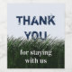 Say thank you to your rental home guests with this inexpensive appreciation wine bottle label. This simple to use label features dark green grass and a light blue "sky". The grass has been painted and given texture to allow the words "Thank You" to peek out from behind the blades. "Thank You for staying with us" can easily be customised to suit your house rental or summer home.