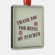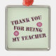 Give your special teacher a holiday gift that lets them know how much they are appreciated. This design features the words "thank you for being my teacher" in pink and purple mosaic along with bright pink flowers. This holiday ornament also features a pale green background which can be customised if you desire.