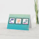 A thank you card with a message inside which reads: Thank you for your help during a crazy transition. Text is customisable to read whatever you like. The front of the card is an aqua green coloured gradient. The design is a cute graphic with 3 squares and inside each square is a separate cute animal. A blue dolphin jumping with the word "peace". A cute kawaii bunny face and red cheeks holding a heart on a stick with "Love" written underneath. And finally an amusing unicorn dancing and squirming with glee - the word "insanity" written underneath.