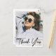 a modern photo overlay card design with a custom photo of the graduate and black script lettering. Feel free to personalise the image and thank you message at the back.