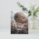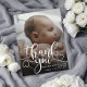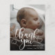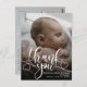 Modern Photo Baby Birth Announcement Postcard. Design featuring thank you script, single photo of the baby, birth stats, date and a name on the front. Personalise with another photo and your thank you message on the back.