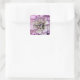 This is a Thank You sticker with a purple and white dahlia flower background on square stickers, matte, small, 1½ inch (sheet of 20).