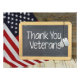 Thank you to veterans on black chalkboard with military dog tags on American flag.