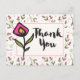 A party thank you postcard with "Thank You" and a pretty pink flower inside a square frame with a pink border. The background is a pattern with hand drawn pink wildflowers with long green stems and leaves on a eggshell white coloured background. Pink circles and sprigs also decorate the design. The back has your personal name and thank you message with a faint flower pattern behind the text. Whimsical and pretty floral design.
