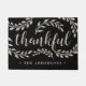 Personalised welcome mat in chic and durable black features "thankful" in hand lettered calligraphy script, surrounded by leaves and branches. Personalise with your names or family name along the bottom for a perfect way to add autumn cheer to your doorstep this Thanksgiving season.