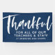 Say thank you to the school teachers and staff with this personalised banner. Perfect for teacher appreciation week, the end of the school year or even the start of a new year, this sign features a navy blue background with a fun modern script thankful along with your custom text that can include the school year or a thank you to specific people.