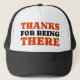#ThanksForBeingThere #TruckerHat #AppreciationStyle #TypographyHat #GratitudeWear #BoldMessage #ThankYouHat #RedBlackWhiteDesign #StatementGear #GratefulVibes