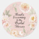 This is a pretty sticker to give out. It says thanks for coming to the bridal shower and has a floral wreath on a beige background.