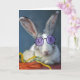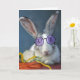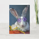 Thanks for the Yummy dinner, paper greeting card with a rabbit wearing round shades in violet and unwrapping a meal of cauliflower and carrots. Art, image, and verse copyright © Shoaff Ballanger Studios, 2022.