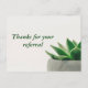 Simple, modern thank you postcards cards for a business to send out to clients, thanking them for their referrals. Thanks for your referral. Customise with your company name on the inside. Features a cute succulent plant and green writing on the front.