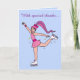 An ice skater in pink decorates this thank you to an ice skating coach. For matching items, type "penguincornerstore skating" into the Zazzle search bar.