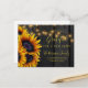 Modern rustic elegant Thanksgiving family holidays moving announcement postcard featuring a beautiful yellow orange sunflowers bouquet and a gold chic typography script over a rustic country dark brown barn wood background with string lights.