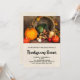 Thanksgiving dinner party invitation with a photograph of a thanksgiving harvest, set on a rustic wooden table. Pumpkin, potatoes, squash etc... make up this bountiful collection of food. Colourful autumn leaves surround the cornucopia basket.