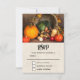 RSVP card with a photograph of a thanksgiving harvest, set on a rustic wooden table. Pumpkin, potatoes, squash etc... make up this bountiful collection of food. Colourful autumn leaves surround the cornucopia basket.