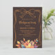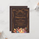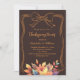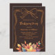A bistre, dark brown coloured background. Decorated with muted coloured fall leaves and a hand-drawn bow. Personalise and add the party details.