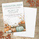 At the bottom, a charming pumpkin patch scene sets the tone—featuring a mix of orange, teal blue or seafoam green, and white pumpkins for a unique fall touch. The overall design blends rustic charm with a pop of unexpected seasonal colour.