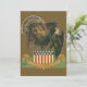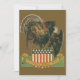A vintage illustration Thanksgiving postcard featuring a turkey and a bald eagle and American flag with the text "Thanksgiving Day."