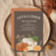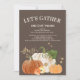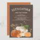 Brown and orange Thanksgiving dinner invitation for friends and/or family. Pretty orange and white pumpkins and glittery gold fall leaves with text, "Let's gather and give thanks." Add your dinner and location information to this beautiful card.