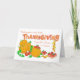 A brightly colored Thanksgiving greeting card 'From Our Home to Yours', with bright orange pumpkins, rosy red apples and colorful fall leaves. The front cover text is, 'Wishing you a very happy Thanksgiving From Our Home to Yours', with the letters of the word, 'Thanksgiving', filled with polka dots, checks and striped patterns in red, orange and yellow, The inside text is just a suggestion which you can easily change or delete if you prefer 'blank inside' greeting cards.
