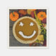 Whipped cream happy face on Thanksgiving pumpkin pie with autumn leaves and gourds on rustic barn wood