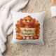 This holiday throw pillow is shown with a Happy Turkey Day print.