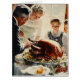This image depicts a classic Thanksgiving scene reminiscent of vintage illustrations. It features a family gathered around a dinner table, joyfully watching as an older man carves a large, golden-brown roasted turkey. The warm light pouring through the window illuminates the family members' faces, highlighting their happiness and anticipation. The table is elegantly set with a bountiful feast, including grapes and decorative garnishes surrounding the turkey. The overall atmosphere evokes a sense of nostalgia, warmth, and celebration.