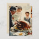 This image depicts a classic Thanksgiving scene reminiscent of vintage illustrations. It features a family gathered around a dinner table, joyfully watching as an older man carves a large, golden-brown roasted turkey. The warm light pouring through the window illuminates the family members' faces, highlighting their happiness and anticipation. The table is elegantly set with a bountiful feast, including grapes and decorative garnishes surrounding the turkey. The overall atmosphere evokes a sense of nostalgia, warmth, and celebration.