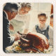 This image depicts a classic Thanksgiving scene reminiscent of vintage illustrations. It features a family gathered around a dinner table, joyfully watching as an older man carves a large, golden-brown roasted turkey. The warm light pouring through the window illuminates the family members' faces, highlighting their happiness and anticipation. The table is elegantly set with a bountiful feast, including grapes and decorative garnishes surrounding the turkey. The overall atmosphere evokes a sense of nostalgia, warmth, and celebration.