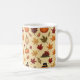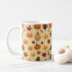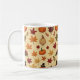 This is a mug with a Thanksgiving pattern. The pattern includes maple leaves representing fall and turkey, which is a Thanksgiving food.