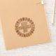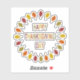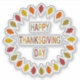 This awesome sticker features a digital art image of a series of Oak leaves in shades of red, orange, yellow and green arranged in a circle around some text with alternating letters of red, yellow, orange and green that says Happy Thanksgiving Day.