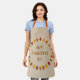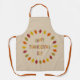 This awesome apron features a digital art image of a series of Oak leaves in shades of red, orange, yellow and green arranged in a circle around some text with alternating letters of red, yellow, orange and green that says Happy Thanksgiving Day.