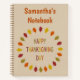 This awesome notebook features a digital art image of a series of Oak leaves in shades of red, orange, yellow and green arranged in a circle around some text with alternating letters of red, yellow, orange and green that says Happy Thanksgiving Day. There is custom text so you can personalise this notebook.