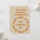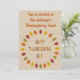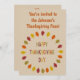This awesome Thanksgiving feast invitation features a digital art image of a series of Oak leaves in shades of red, orange, yellow and green arranged in a circle around some text with alternating letters of red, yellow, orange and green that says Happy Thanksgiving Day. There is customisable text on the front and back so you can personalise this invitation.