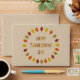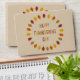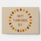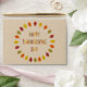 This Thanksgiving envelope features a digital art image of a series of Oak leaves in shades of red, orange, yellow and green arranged in a circle around some text with alternating letters of red, yellow, orange and green that says Happy Thanksgiving Day.