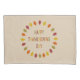This awesome pillowcase features a digital art image of a series of Oak leaves in shades of red, orange, yellow and green arranged in a circle around some text with alternating letters of red, yellow, orange and green that says Happy Thanksgiving Day.