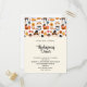 Invitation postcard with a seasonal Thanksgiving pattern. Featuring whimsical pilgrims, turkeys, pumpkin pie and other various autumn themed elements.