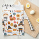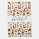Kitchen towel with a seasonal Thanksgiving pattern. Featuring whimsical pilgrims, turkeys, pumpkin pie and other various autumn themed elements. Grateful written in the centre.