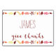 Thanksgiving place cards (horizontal) with colourful fall leaves decoration on white background, printed on both sides. There is a customisable text, where you can add guests name or table number. Place cards with same or similar design with autumn leaves are available too in vertical position.