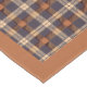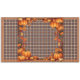 This Thanksgiving table cloth has brown and blue plaid with autumn leaves and pumpkins and a border matching the plaid.