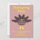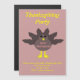 This awesome magnetic party invitation features a cartoon of a turkey with big black eyes, a small yellow beak and tail feathers sticking up. The feet are facing in opposite directions making the turkey look goofy. The turkey has pink text on its’ belly that says “Happy Thanksgiving” and it looks like the feathers have been plucked out to reveal the message. There is customisable text so you can enter all your party details.