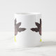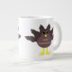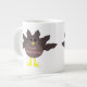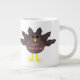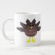 This awesome mug features a cartoon of a turkey with big black eyes, a small yellow beak and tail feathers sticking up. The feet are facing in opposite directions making the turkey look goofy. The turkey has pink text on its’ belly that says “Happy Thanksgiving” and it looks like the feathers have been plucked out to reveal the message.