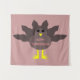 This awesome tapestry features a cartoon of a turkey with big black eyes, a small yellow beak and tail feathers sticking up. The feet are facing in opposite directions making the turkey look goofy. The turkey has pink text on its’ belly that says “Happy Thanksgiving” and it looks like the feathers have been plucked out to reveal the message.