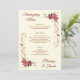 A delicate fall/Thanksgiving design that evokes leaves blowing in the wind. Red maple leaves glide across the menu amid burgundy and gold flourishes. Bits of gold glitter textures mix with the swirls to suggest the golden glow of autumn. Burgundy, gold, and orange text sits framed amidst the tumbling leaves and breeze on a cream background. A perfect motif for any fall or Thanksgiving gathering!