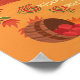 A colourful turkey bird displays its plume. Fall leaves and a bountiful harvest adorn the scene.