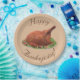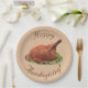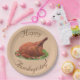 Design features the image of a baked turkey as centre design. The words "Happy Thanksgiving!" are displayed as an arch above and below image in brown lettering. Background is a light shade of tan. All text is customisable.