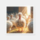 A group of white turkeys stands in a barn with one prominently wearing a sign that reads "Eat Pork."